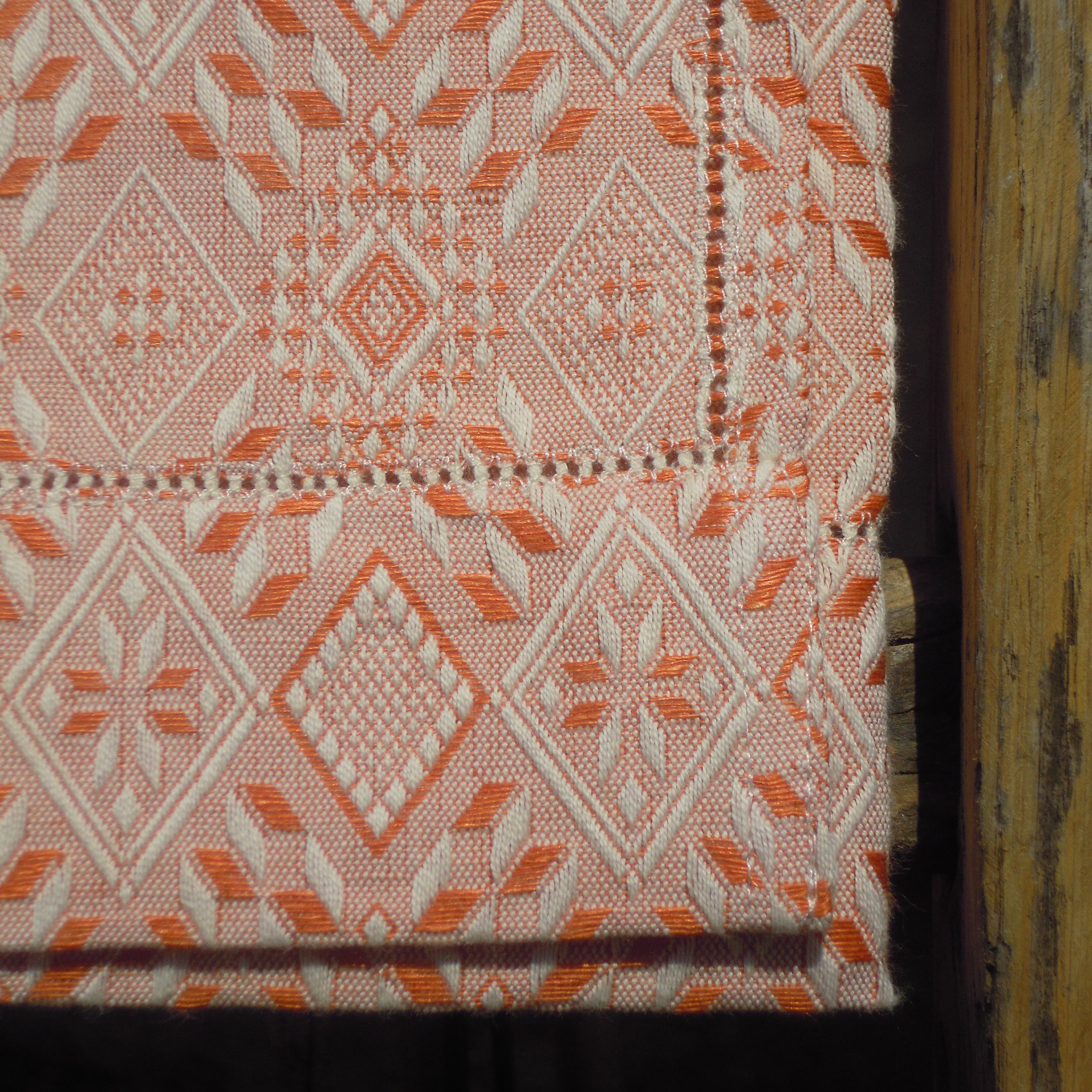 Set asciugamani, tessitura artigianale in misto lino/cotone con disegno in biscotto salentino, finitura a punto giorno, color zenzero