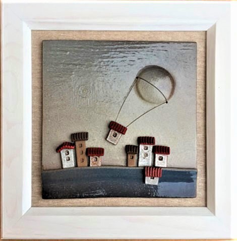 Tableau, handmade ceramic piece. Unique piece. Large size cm 36. White frame