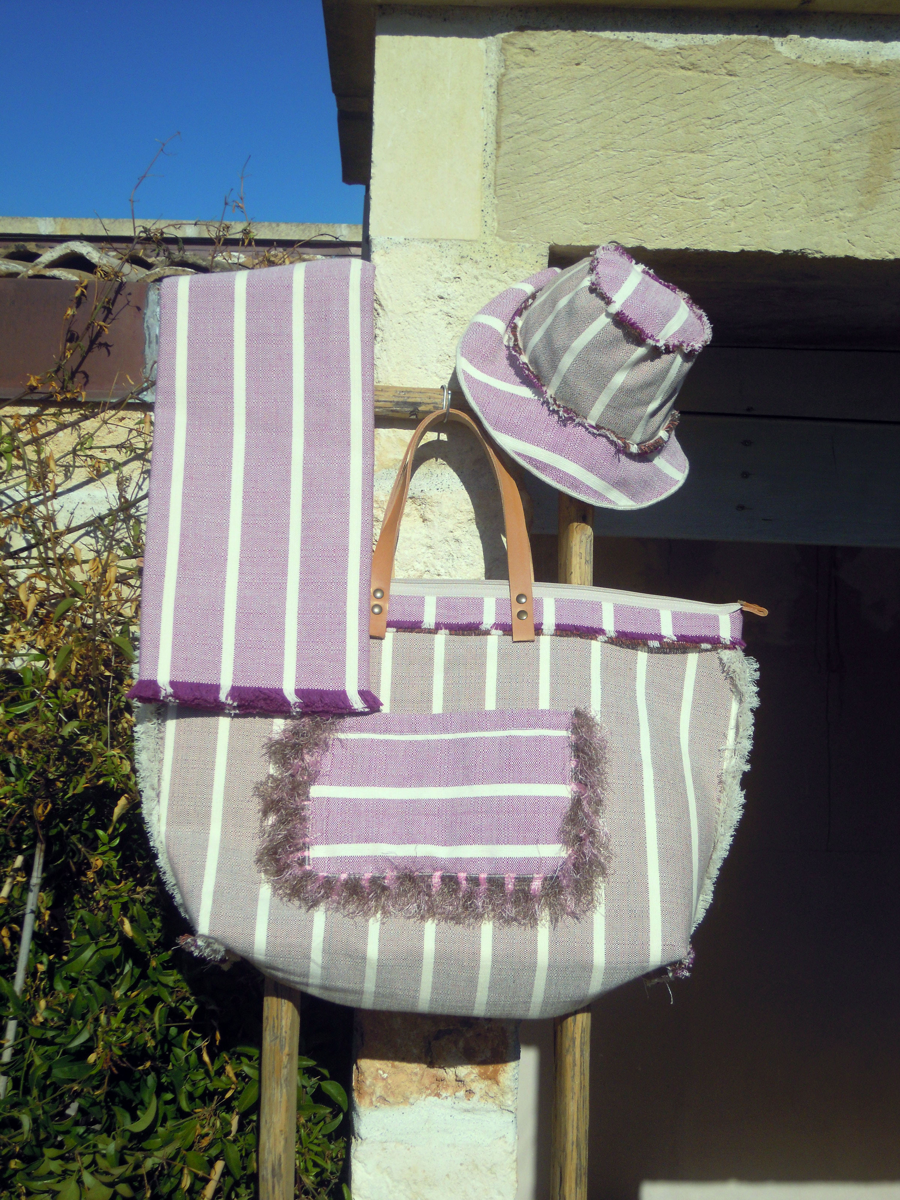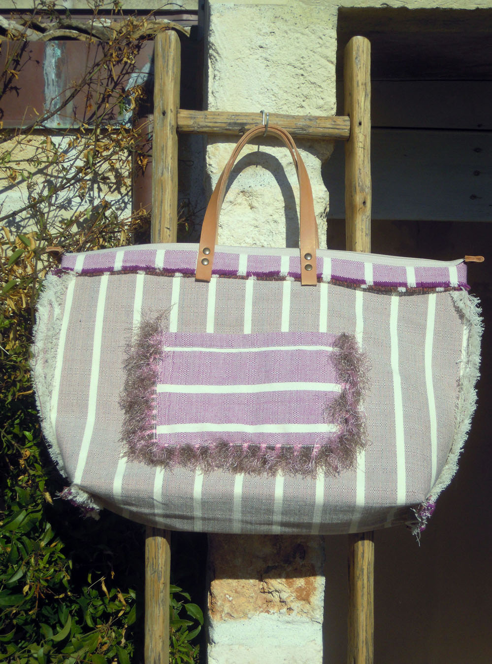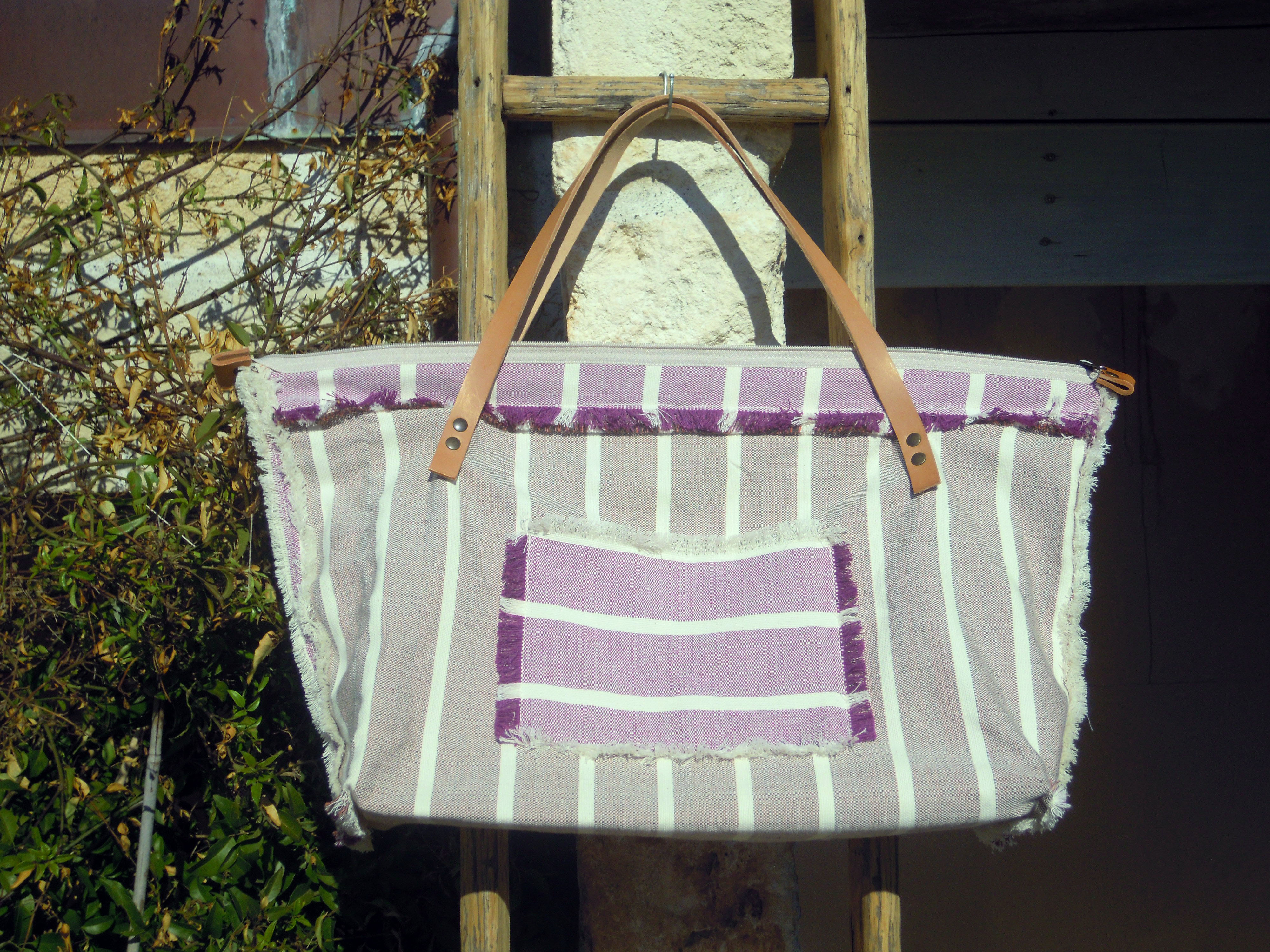 Cotton bag with violet stripes design, leather handles