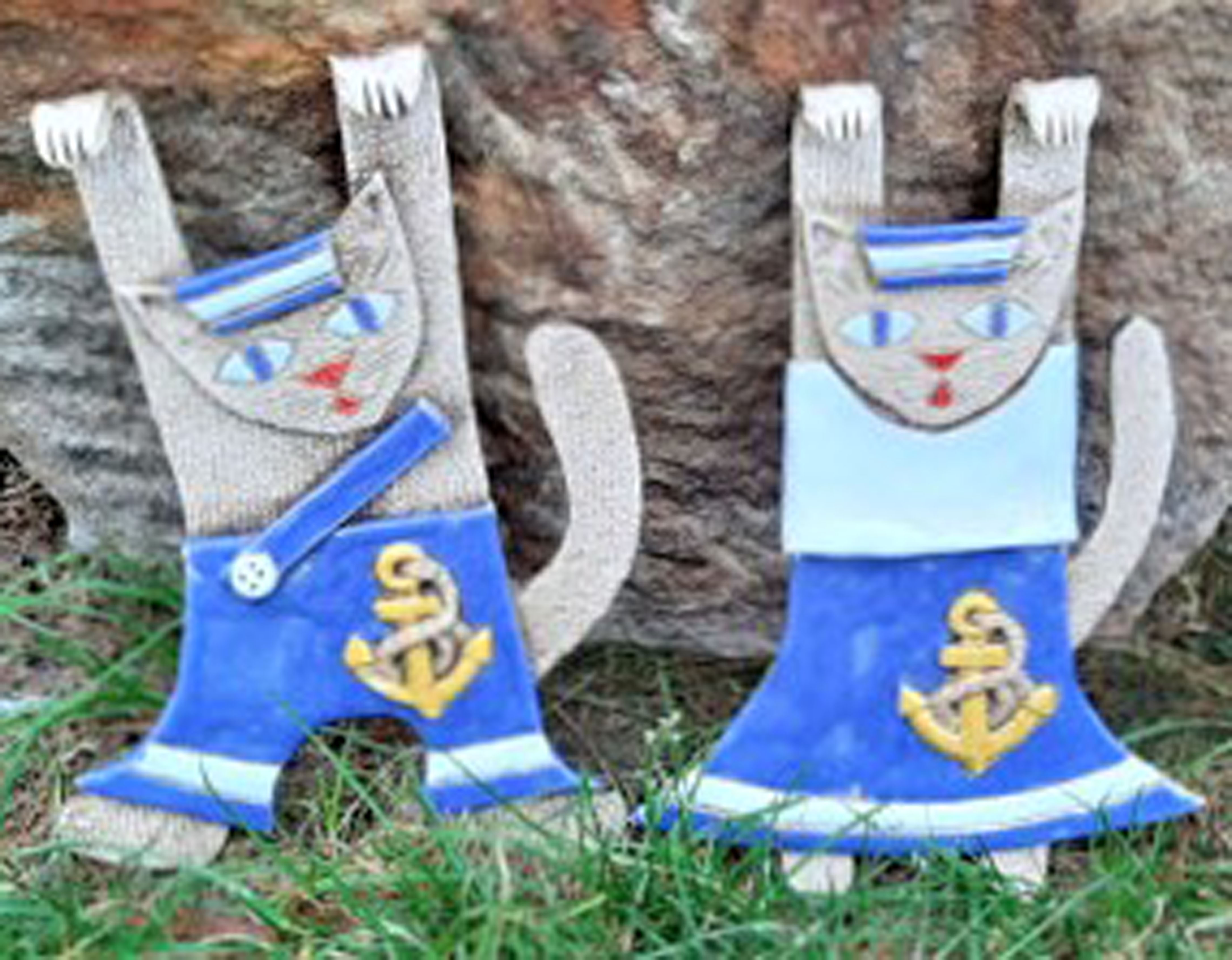 Gatti volanti con ancora, pezzo unico artigianale in ceramica. Altezza cm 22