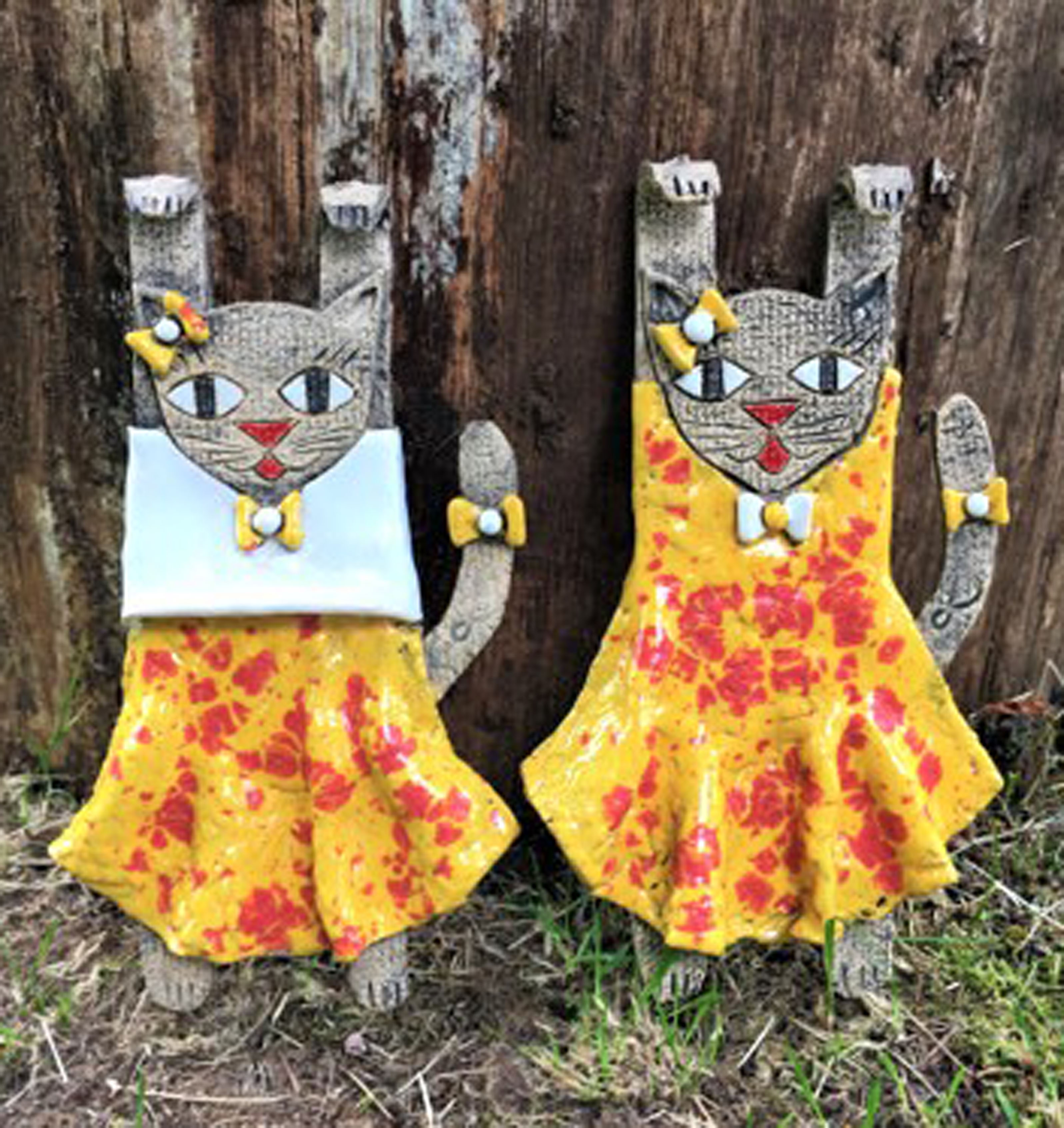 Gatti volanti con i fiocchi, pezzo unico artigianale in ceramica. Altezza cm 22