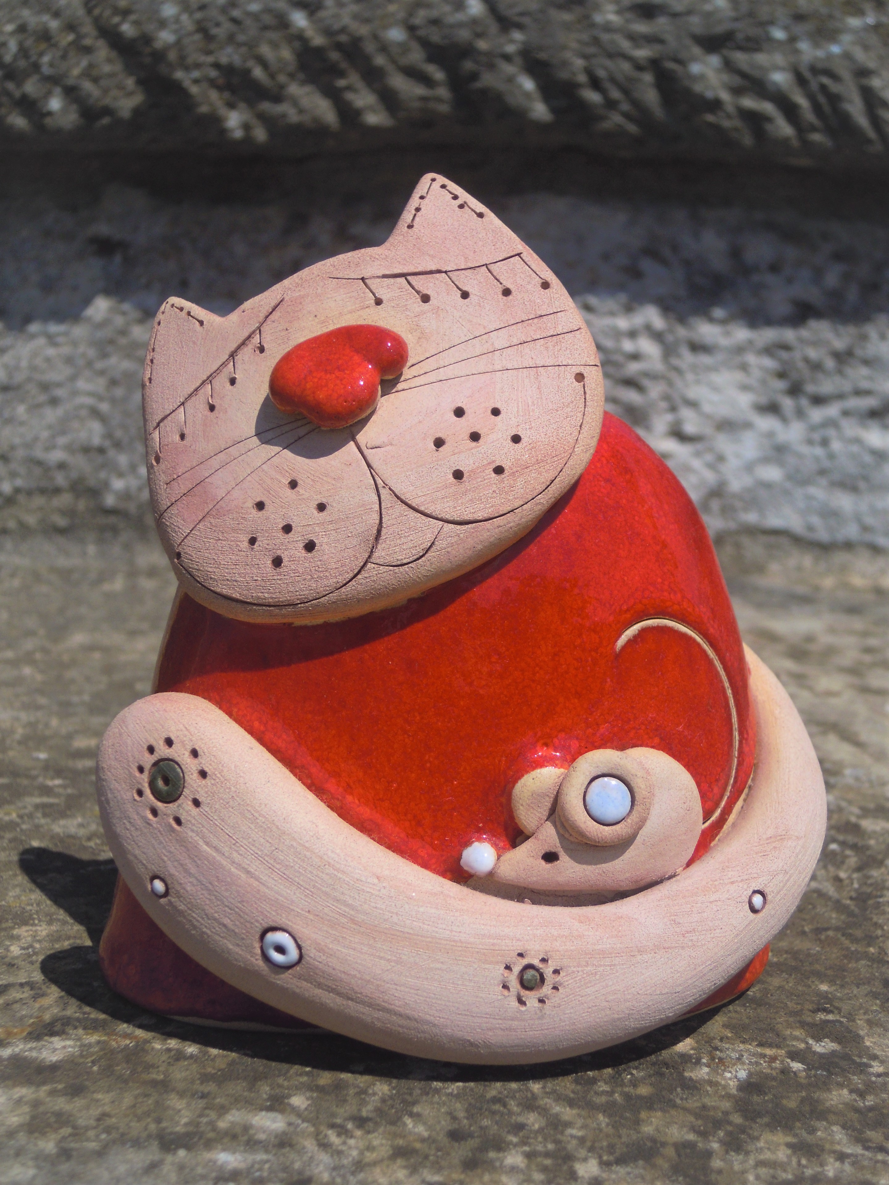 Gatto campanella mini, pezzo unico in ceramica. Colore rosso, con topolino