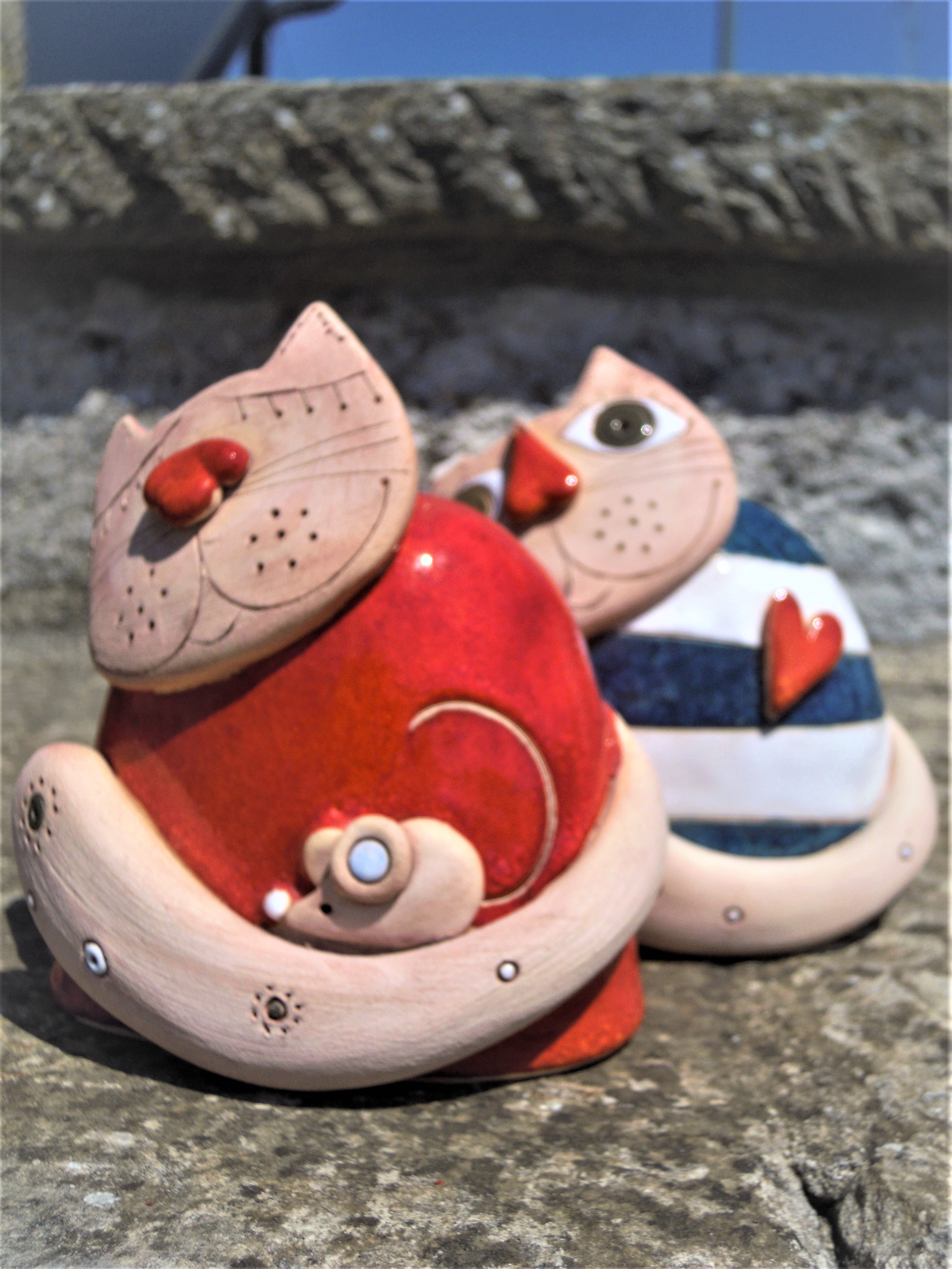Gatto campanella, pezzo unico in ceramica. Colore rosso, con chiocciola