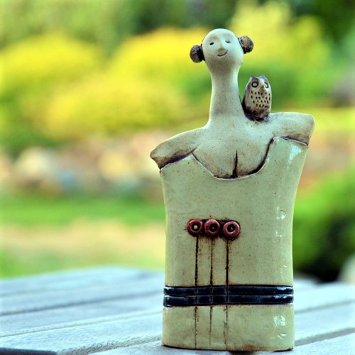 Lady e gufetto, pezzo unico in ceramica, cm 21