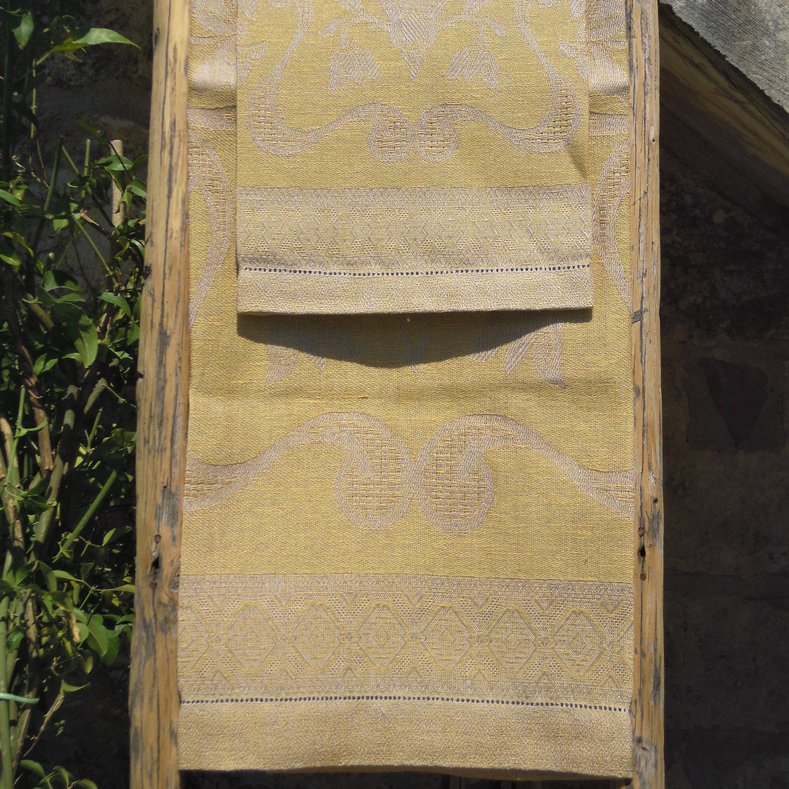 Set asciugamani, tessitura artigianale in puro lino con disegno giglio, finitura a punto giorno, colore giallo