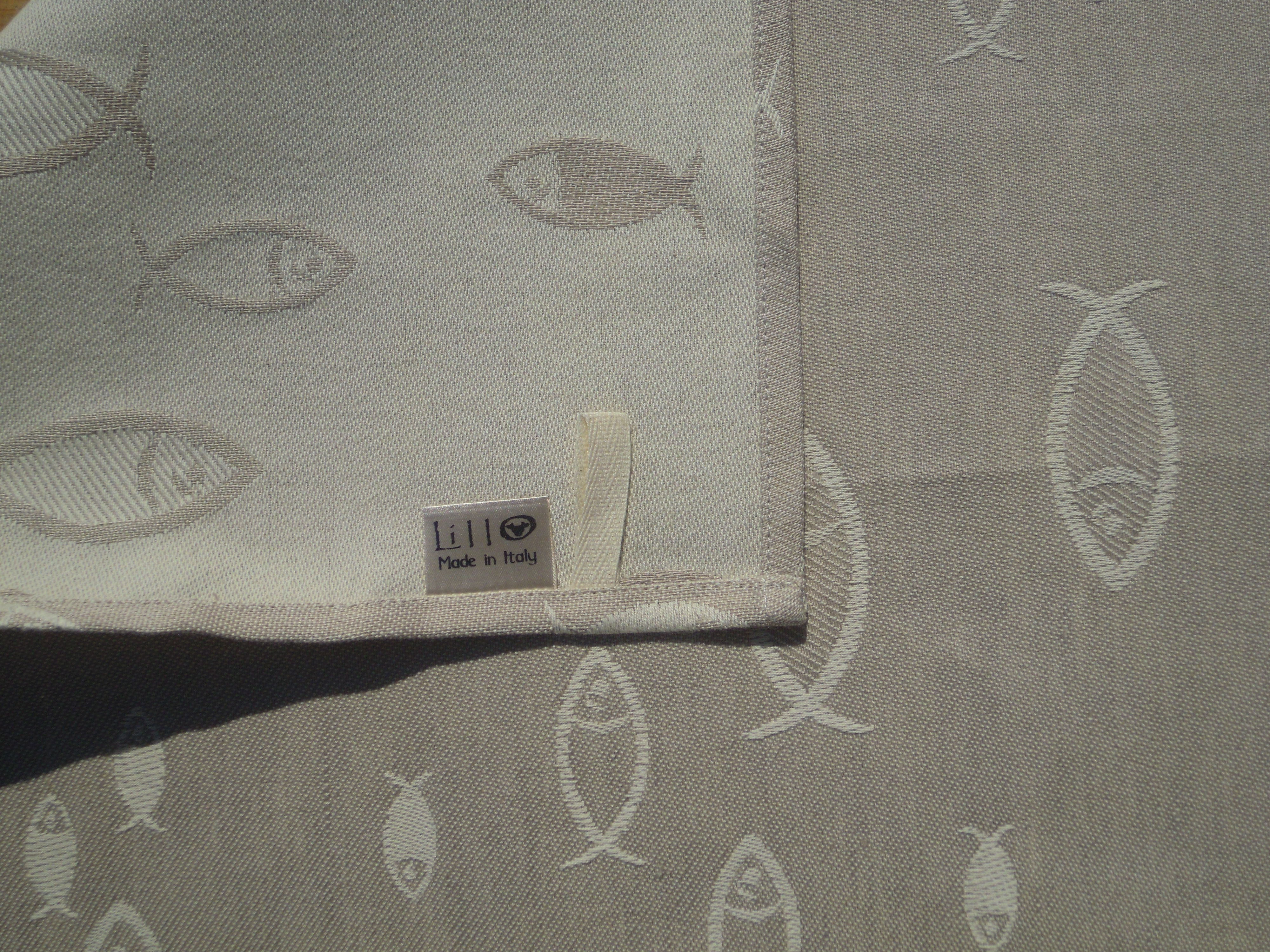 Strofinaccio, tessitura artigianale in misto lino/cotone, disegno con pesci di colore tortora.