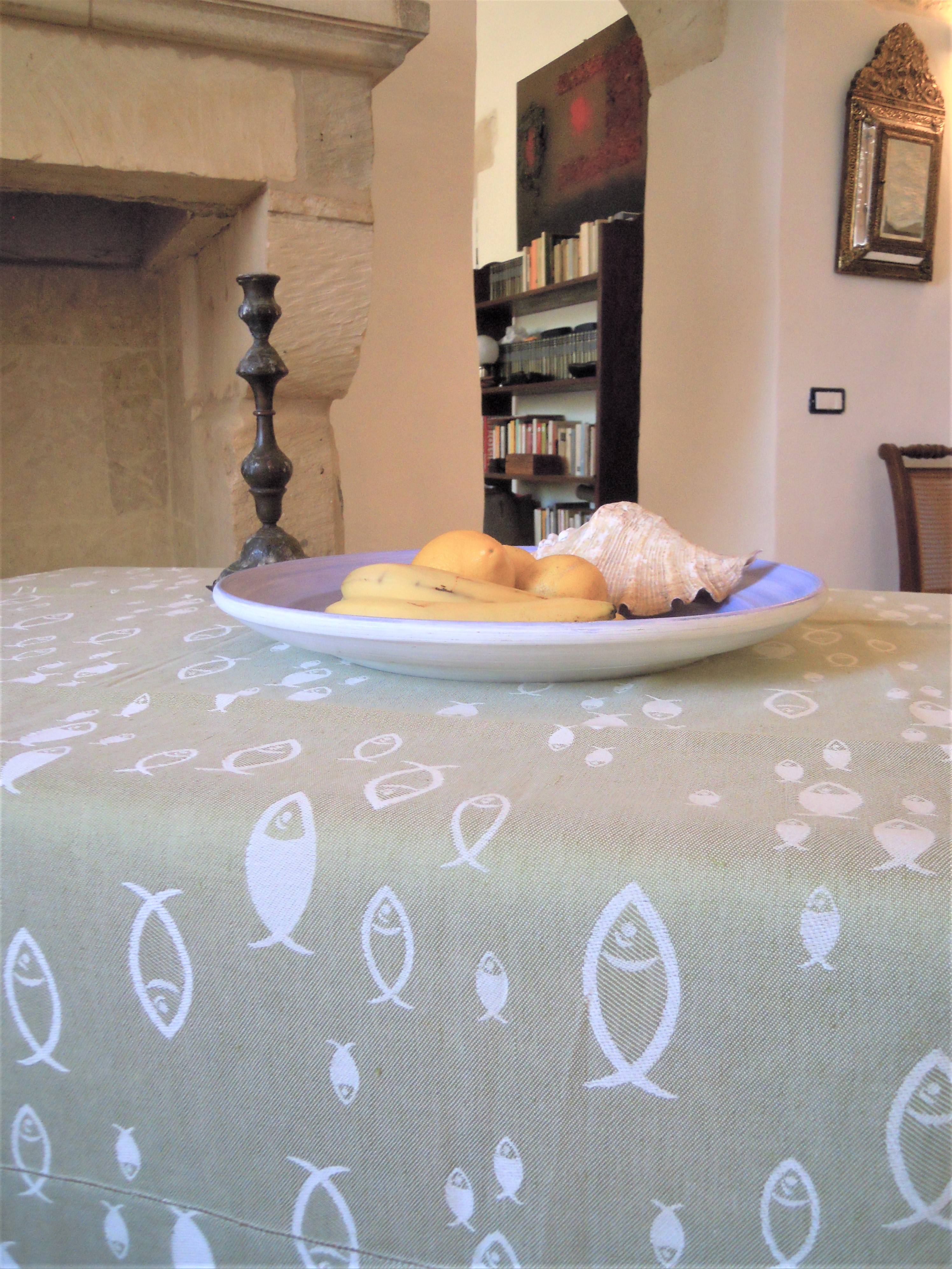 Tovaglia tessitura artigianale in misto lino e cotone, disegno con pesci, verde muschio
